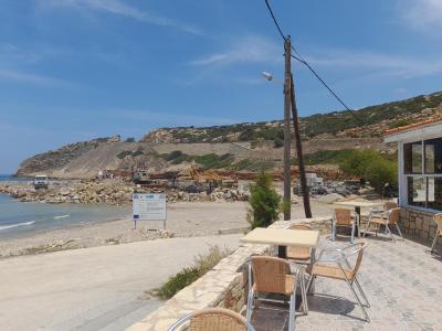 Bez pláže- buduje se malý přístav, hotel u stavby, moře ciste