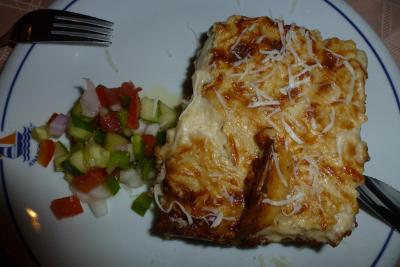 Večeře byly mnohem lepší (velká volba nápojů: džusy, pivo, víno, minerální voda, sprite, cola,...), předkrm (většinou zeleninový salát, sýr s rajčaty, opečené cukety se sýrem, malá musaka, smažený sýr ), hlavní jídlo a zákusek či ovoce ve formě plátků melounů. Během našeho pobytu se hlavní jídlo neopakovalo (viz fotogalerie). Zklamáním pro nás bylo jídlo nedochucené - zejména solí se fakt šetřilo, citrónové nepoživatelné brambory, smažený pangasius, některé moučníky snad kupované z obchodu... Jídla byl na večeři relativně dostatek, takže moc toho v okolních tavernách nemáte šanci v pozdních hodinách večer ochutnat.