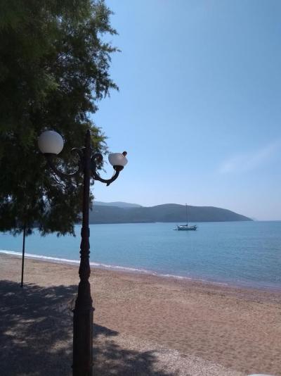 Krásná pláž se nachází přes menší silnici, s pohledem na ostrovy Sapienzta a Schiza.