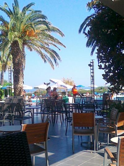 Zařekla jsem se, že budu jíst převážně ovoce a zdravé věci, ale po tom, co jsem viděla první snídani, přesvědčení šlo vniveč..nevíte co si vybrat. . Výběr množství sladkých zákusků, koláče, čerstvé kobližky, bábovky, tenounké teplé palačinky. Ze slaných..salámy -několik druhů, sýry, pomazánky, míchaná vejce, slanina, párky, různé druhy pečiva, od celozrnných až po veky,... Řecké jogurty, zvlášť meruňkový kompot, med a další přísady, vše krásně upravené a doplňované. Nikdy se nestalo, že něco bylo prázdné. Večeře-sen..to se ani nedá popsat..několik druhů masa, přímo před vámi flambované na víně, grilované kuře, ryba, zvlášť omáčky..dále klasika..rýže, opečené brambory, různé druhy zeleniny, dle řecké tradice a zákusky jsou kapitola zvlášť...malé dezertíky, luxusní pěna, zmrzlina, ovoce, melouny, víno, broskve atd. Personál se chová velice mile, stále se vás ptá, zda jste spokojeni. Tímto jim chci i poděkovat..stolování odpovídá 5*, není co vytknout + krásný výhled do zahrady…