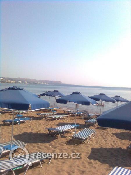 Moře nádherně čisté a teplé, pláž taky čistá, při výletech autem se dá najít i spousta opuštěných pláží, vždy krásná voda. Na pláži písek, pak ve vodě kousek kameny a pak zase písek. Žádní ježci, v pohodě naboso. Jen u pláže Afantou malé medůzy, ovšem neškodné. Pozor, prý je dobré u této pláže neplavat moc daleko do moře, přítel české recepční tam prý lovívá žraloky, jaké, to nevím. Lehátka se slunečníkem na pláži jsou za 8 Euro za pár lehátek/den, dá se najmout i jedno za 4 Eura.