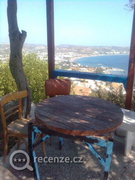 Všude binec, PET láhve, různý odpad, vraky vozidel, binec i u domků, nedokončené, opuštěné stavby, ale taky třeba ohrada se třemi oslíky. U nás je úplně jiný svět a řekl bych, že podstatně hezčí. Je fajn, že noční podniky jsou dále od hotelu, takže neruší spaní. Podobá se to tam trochu vzdáleně Stodolní v OV, jen je to více venku a s krámky, ne jen s bary a diskotékami. V noci narváno, neviděli jsme ale žádné rvačky, nebo nějaké potíže. Ráno hned po snídani, nebo k večeru doporučuji procházku na kopec, který je vpravo od hotelu, z druhé strany kopce je z jeho vršku vidět pěkná, malá pláž, na kopci je kostelík a posezení - lavice, stůl, olivovník - viz foto, je vidět celé Faliraki a kus moře, fouká vítr, takže není horko, prima místo k přemýšlení, nebo četbě knihy. Nikde nikdo, opravdu odpočinek. Při výletech autem se nám líbil starý Rodos - město, když si tedy odmyslím nepořádek, městečko Lindos s vyhlídkou od kláštera - akorát moc lidí, klid byl ve vsi Mesanagros s úzkými uličkami a prý asi jen třicítkou obyvatel, kde jsme si dali kafe pod fíkusem, který nám doma živoří a tady to byl ohromný strom. Kousek od hospůdky bylo ve zdi sršní hnízdo. Všude jsou toulavé kočky, krásné a ty úzké uličky s typickými jižními stavbami a taky neuklizené trosky domů a opuštěné, rozbité stavby.... Při hodinovém přejezdu vnitrozemských hor po prašné, kamenité cestě na jedničku - asfalt bez varování skončil - jsme viděli kilometry spálené krajiny od obzoru k obzoru po požáru, který tam byl prý 14 dní před našim příjezdem, tohle byl zážitek úplně nový a prý jsou požáry na ostrově běžné. Často jsou v horách malinké kostelíky, většinou otevřené. Bývají u nich kohoutky s vodou a tady pozor - pustíte vodu kdekoliv na ostrově v přírodě, pokud teče, často jen kape a do 20 vteřin na kohoutku sedí sršeň, nebo i tři a pijí. Je znát, že o vodě vědí a hned přiletí. Neviděli jsme vosy, ale takových 30 sršní denně ano, ale v klidu, nejsou útočné. Připadaly mi trochu menší, než u nás. V autě jsme ale raději měli za jízdy zavřená okna...