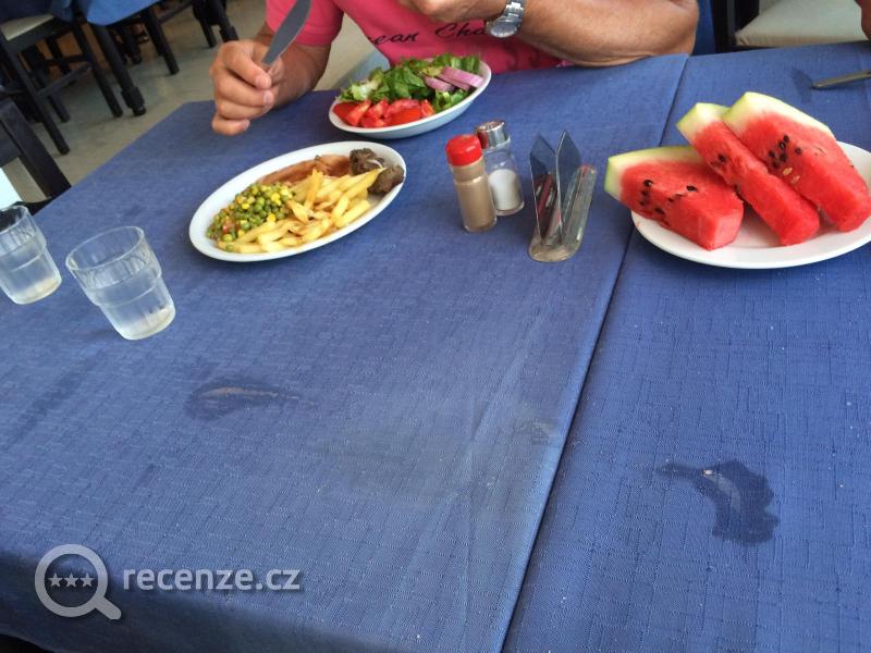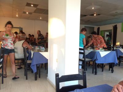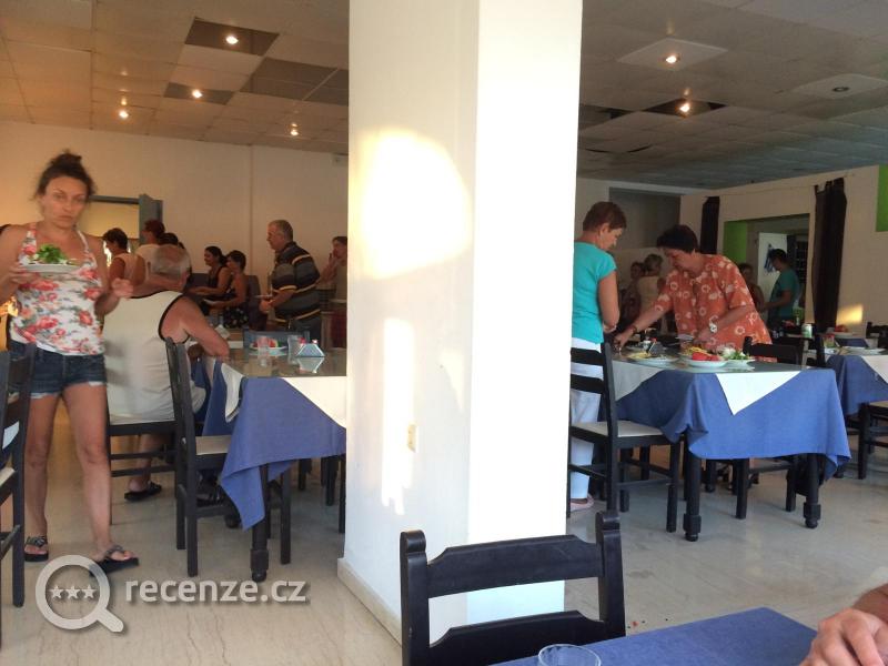 Prostředí jídelny katastrofa, chyběly malé lžičky do kávy, stoly, kde nebyly ubrusy přikryty sklem polité, drobky od snídaně jsme měli i při večeři, dát si něco na pití po večeři zcela nemožné, bar bez obsluhy (ta uklízela nádobí)