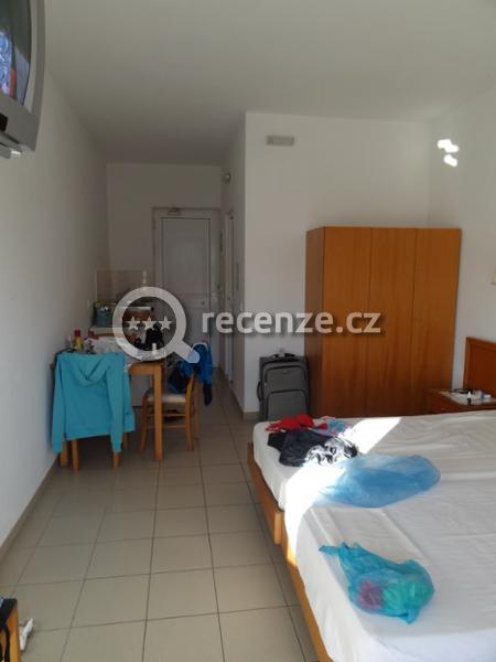 Pokoj pro 3 osoby, číslo 135 se nachází v druhé budově. Výhled z terásky do zahrady a směrem k bazénům - výhodou bylo umístění na západ, takže dopoledne tu byl suprový stín. Pokoj byl i s kuchyňským koutem - vybavení plně dostačující - pánev, hrnec, skleničky, hrníčky, příbory. Vedle byla lednička s rychlovarnou konvicí. Dále stoleček se sezením pro 3 osoby. V pokoji skříně na věci a zrcadlo s prostorem k sezení. Postele pohodlné s menším polštářkem a jako přikrývka byla prostěradlo. Nám se ubytování velice líbilo, neboť primárně sloužilo k přespání, nikoliv ke strávení veškerého času dovolené.
