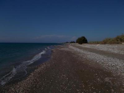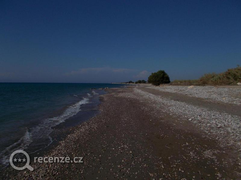 Oblázková pláž, trochu písku, lehátka a slunečník za popl./ 3e na den/, sprcha a převlíkárna. Moře čisté, v okolí vodní sporty využívající vln a větru.