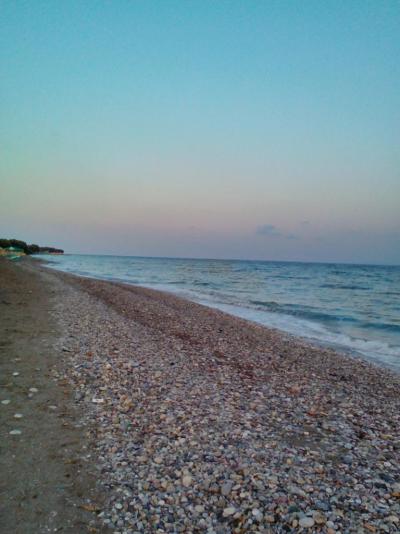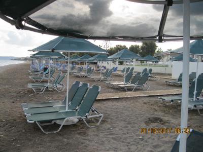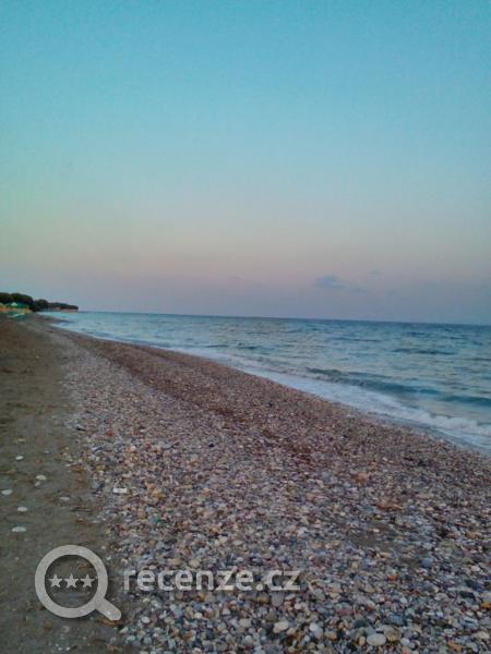 Na pláži hodně foukal vítr a byly tedy i větší vlny. Díky kamenité pláži nebyl příjemný vstup do moře. S malým dítětem to nešlo vůbec. Moře jinak krásné barvy a čisté.Během dne obsazená lehátka na pláži i u bazenu.