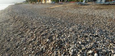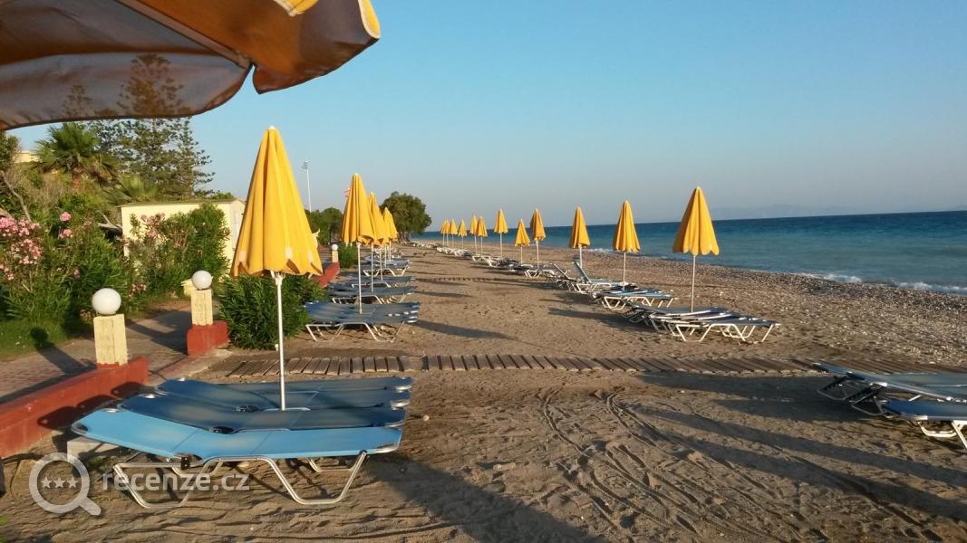 Hotel je přímo u pláže. Pláž je oblázková, menší i větší oblázky,. Ačkoliv já ji nepotřebuji, myslím, že je vhodná obuv do vody, alespoň na ten přechod, protože kousek od břehu je již písečné dno. Vzhledem k tomu, že na západní straně Rhodu stále pofukuje vítr, je moře vždy s vlnami, ať už menšími či většími. Lehátka a slunečníky jsou v ceně pobytu. Moře bylo už v době našeho pobytu příjemné prohřáté, takže koupání velmi pěkné.