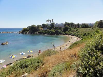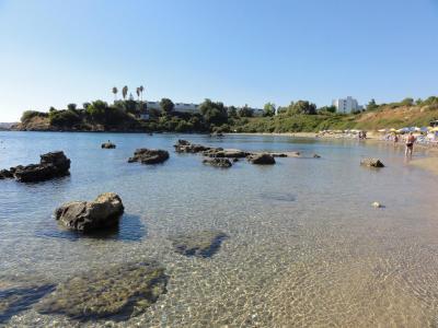Moře velmi čisté a díky zátoce s pláží zde nejsou vlny. Cesta na pláž cca 8 minut, k pláži se sejde po pár schodcích. U pláže "KANTÝNA" ) malý bufet s kvalitními službami, minutkovým jídlem a nápoji. Ceny příjemné (káva frapé 2€, pivo 3€ }.