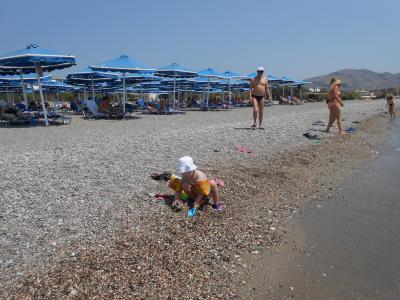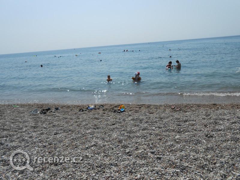 plaž u lehátek byla písčíta ale jak člověk šel k vodě tak kamínková .vstup do moře pozvolný.moře teploučke čiste.no byla to paráda.byl tam taky stánek spítím a sendviči,ovocem zmrzlina, vše all inclusive.lehátka a slunečníky zdarma