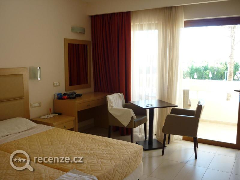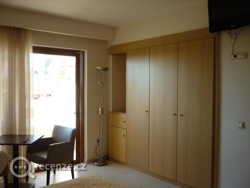 Byli jsme ubytováni v pokoji ve druhém patře s balkonem, ze kterého byl nádherný výhled na areál hotelu a v pozadí moře a hory. V pokoji byla klimatizace, lednice a trezor zdarma. Bylo zde čisto, každý den jsme měli vyměněné ručníky a hlavně vynesený odpadkový koš :) (v Řecku je úzké kanalizační potrubí, toaletní papír se nesmí splachovat) Pokojské byly příjemné.
