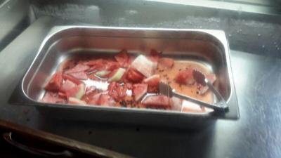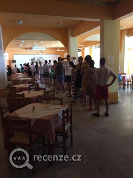 Jídlo nemělo chuť. Buď bylo přesolené, přepepřené nebo se nedalo jíst. Každý den těstoviny. Vepřové maso strašně tuhé. Když jste přišli cca 30min před koncem, tak už nebylo co si vzít. Personál nedoplňoval. Pouze dva druhy ovoce, žlutý a červený meloun, který byl vždy nedozrálý. Pečivo zaváží v osm hodin, takže před osmou dostanete pečivo z druhého dne. Hrozné fronty jak na jídlo, tak i na pití, kde Vám ho vydá obsluha, ovšem pouze jednu skleničku na osobu.