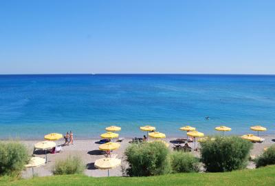 Pláž oblázková, moře velmi čisté, 10 m od břehu již nedosáhnete(informace pro ty, co neumí plavat). Za 2 lehátka se slunečníkem zaplatíte 7 EUR, můžete být u bazénu, tam se neplatí ale pravdou je, že důchodci z NDR mají lehké spaní a vstávají ve 4 ráno a všechna lehátka u bazénu zaberou svými ručníky.
