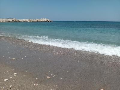 Lehátka a slunečníky - pokud jsme přišli do deseti, tak se místo vždy našlo. Bohužel, nešvar zablokování lehátka osuškou byl i zde, tabuli s prosbou v několika jazycích nikdo nerespektoval, asi byla moc malá. Odpoledne jsme se vraceli zpět na pláž před třetí hodinou a taky jsme místo vždy našli. Kromě hotelových setů tam jsou ještě sety s bílým slunečníkem pro ostatní návštěvníky, ty jsou za 10 Euro. Pláž - písčitá s kamínky. Vstup do moře taky písek a kamínky, děti zvládly bez bot, záleží, jak je kdo zvyklý. Moře teplé, čisté.