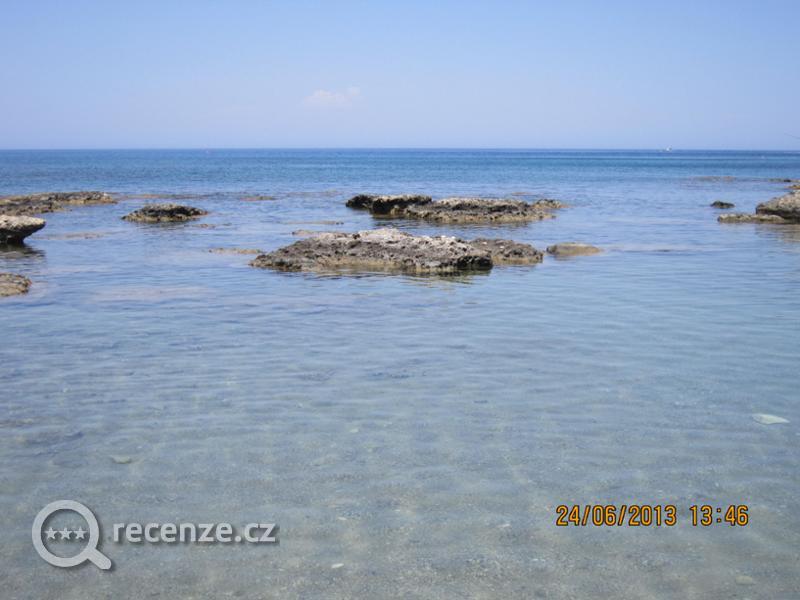 Pláž na levou stranu od hotelu 7 minut plíživé chůze - super, čistá, písčito-oblázková, včetně toalet a 3 sprch. Vhodné jsou botky do vody. Lehátka a deštník za 8 Eur na celý den.