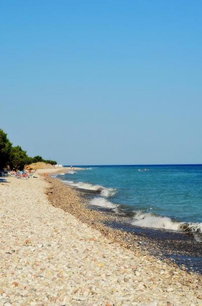 Velká výhoda je, že je pláž hned u hotelu, přes malinkou silnici, kde je opravdu minimální provoz. Moře je krásně čisté, mírné vlny. Jediné mínus jsou oblázky a větší kamínky, preferuji písčitou pláž, ale i ta se dá o kousek dál najít.
