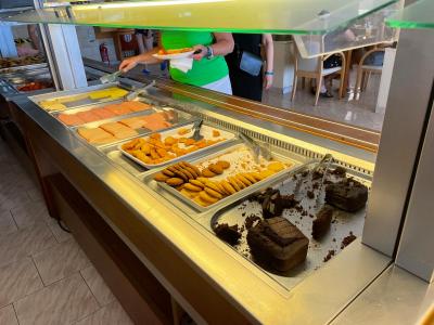 Jídlo byl výsměch řecké gastronomii, z 80 % šlo o rozpékané polotovary, hodně smaženého, téměř žádné čerstvé ovoce ( pokud nepočítám pár kousků melounu a švestek u večeře, pokud se na vás dostalo), ze zeleniny především tuhé nakrouhané zelí , řepa nebo mrkev , imitace vajíček ( to jsme ani netušili, že něco takového existuje) menší olivy na trhu najdete už těžko….víno něco jako u nás krabicové.O dopoledních i odpoledních občerstveních se moc nedalo mluvit, když nepočítám sušenky. Jídlo jsme opakovaně řešili v jiných restauracích....