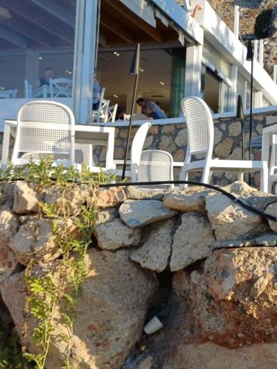 V restauraci se při každém jídle přilepíš lokty ke stolu, ubrusy, které jsou na promo fotkách bys hledal marně. Nezachrání to ani papírové prostírání, které ti odlétne, jen se odlepíš od plastové židle. Ani jednou jsem neviděla, že by někdo stůl utřel. Chybějící hrníčky již ráno v 8 hodin, opět nezachrání ani obsluha, která narychlo tři ručně umyje přinese. Nechápavě na sebe koukáme s ostatními klienty a popíjíme jakýkoliv nápoj, který má příchuť moře. I mátový čaj tady chutná slaně. Všude přítomný smrad kanalizace k chuti na jídlo opravdu nepřidá.