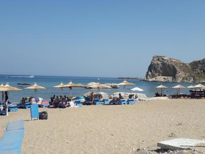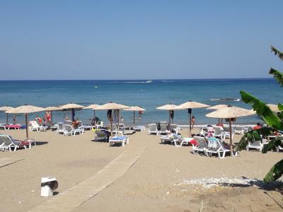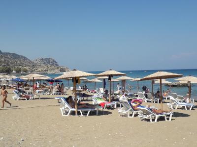Pláž čistá, udržovaná, rezervace slunečníků pohodlná za 6 E na den. Moře opravdu nádherné. Velice poklidná zátoka, málo lidí na pláži i v moři, vynikající pohoda!