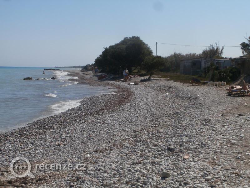 Žádné oblázky, ale šutry, úzká vzdálenost opravdu kousek asi 100 - 150 m, žádný, ani placený servis, snad 5 lehátek, které si tam dotákli klienti, deštníky žádné. Voda kalná, asi z písku, vlny s kruhem s nesli i děti - houpací, vstum do moře po kamenech, pak písek, vodní sporty u vedlejšího hotelu asi 300 m,
