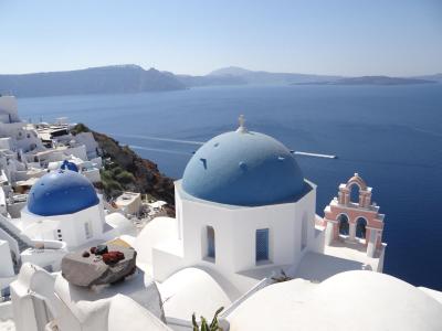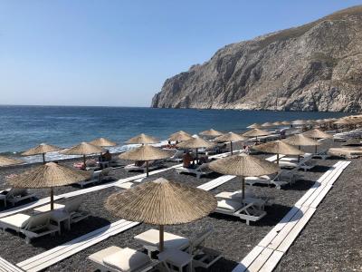 Ostrov krásný - Fira, Oia, všude je velké množství turistů. Hotel je umístěn ve městě Kamari, ne na úplně hlavní silnici, přesto neskutečný hluk - čtyřkolky, skútry, parkování čtykolek, přistávání letadel, do 4 ráno kravál, od 5 hod znovu, takže se nevyspíte. Hledala jsem jednoduchý hotel jen na přespání :-), no nevyšlo to. V hotelu byly snídaně - v této kvalitě bych je zrušila - toustový chléb s Lidlu, jeden druh sýra, salámu, rajče, okurka bez chuti. Jídlo v tavernách dražší ale výborné. Pláž pěkná, oblázková - boty do vody.
