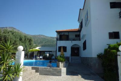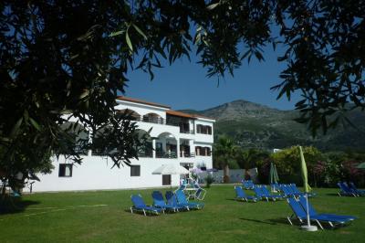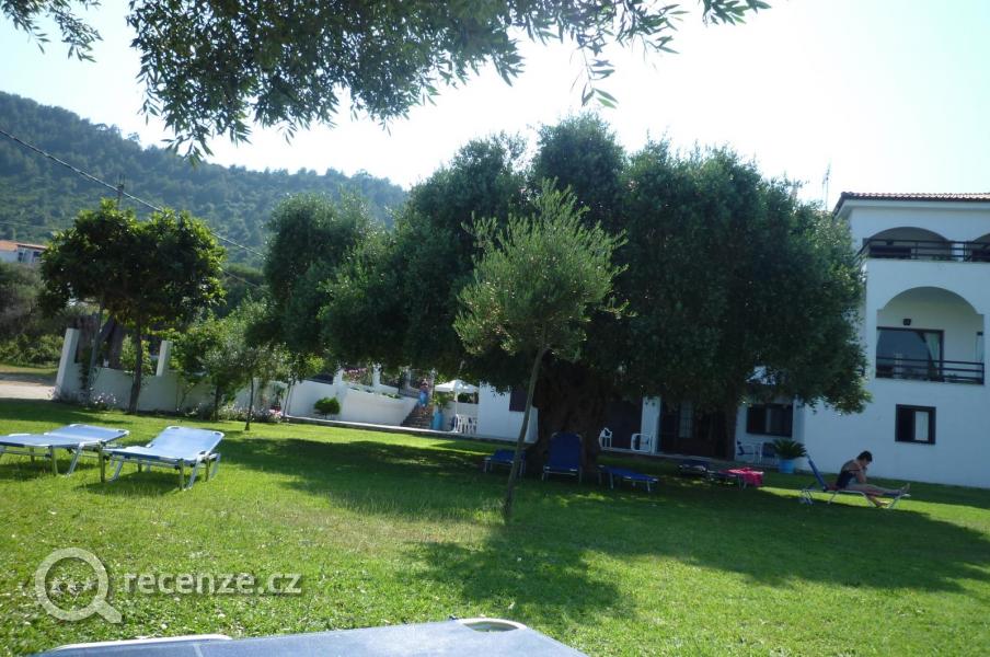 Rodinný penzion v klidné části ostrova. Zelená zahrada s olivovníky, slunečníky a lehátky, k moři pár kroků.