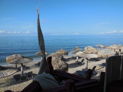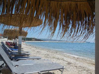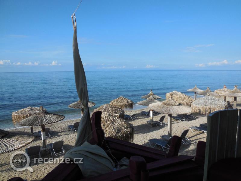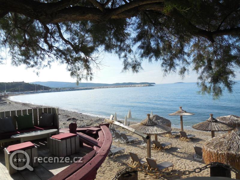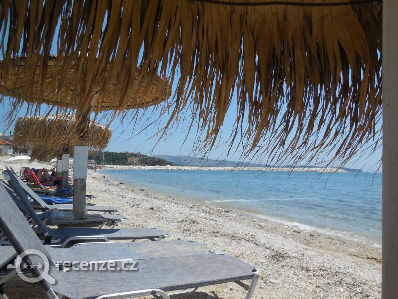 Pláž přímo u restaurace, 26 slunečníků s lehátky zdarma při nějaké té konzumaci - obsluha až na pláž - naprosto OK. Nikdy nebylo plně obsazeno. Vstup do moře oblázky + písek - je dobré využít podvodní "mola" z pytlů s nasypaným pískem, přes která se pohodlně dostanete přes větší oblazy hned u okraje moře. Voda čistá, velmi teplá.