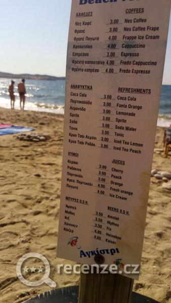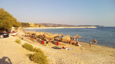 My jsme chodili na pláže cca 100 m západně - Navagio beach, Agistri beach, Vanilla beach). Pláže oblázkovo-písčité, většinou přináležející nějaké restauraci, celkem udržované a čisté, slunečníky a lehátka za konzumaci kávy, limonády, piva atd, ceny nápojů od 3 EUR výše.
