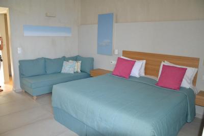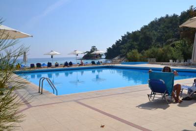 U recepce je příjemné posezení. Pro cizí lidi je vstup do areálu zpoplatněn 3 eury, k dispozici bazén (lehátka u bazénu zdarma). Miniclub pro děti, toaleta, záchod, převlíkárna, hriště na basketbal, na tenis, volejbal (cena 10 euro), možnost zahrát si i pingpong, venkovní i vnitřní restaurace. Ve venkovní restauraci se i griluje. Je zde taverna, kde se pořádají řecké večery, delfín bar u pláže - krásné a romantické při západu slunce především, je zde i ohrada s daňky a srnkami, Procházejí se tu pávy.