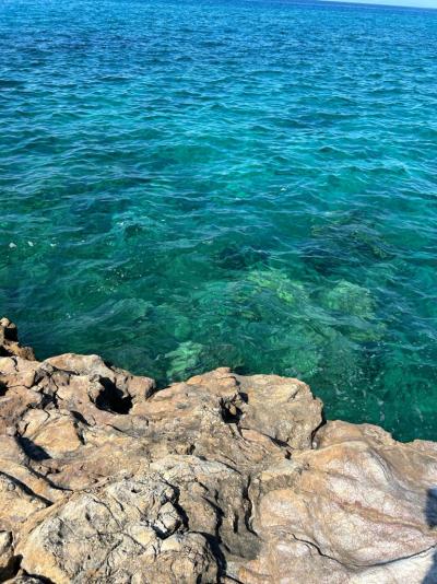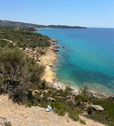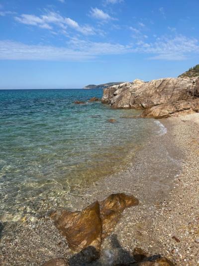 Pláž poklidná, což nám vyhovovalo. Hned pod tavernou lehátka a slunečníky zdarma. Ani nekontrolovali, zda jsme si u nich něco koupili. Nedaleko nudistická pláž, která byla většinou prázdná. Koupání tam úžasné. Moře průzračné všude. Doporučuji boty do vody.