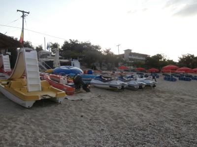Kamenitá, krásná, pláž s rychlým stupem do hloubky. Jediný, ale opravdu velký problém vidím v tom, že právě před tím malým úsekem pláže, který mají hosté Albatrosu k dispozici (lehátka a slunečníky zadarmo), má pan majitel "zaparkované" pro sportovního vyžití vodní skůtry, lodě a další vodní atrakce, takže jsme si připadali jak na benzínové pumpě. Vítr vanul z moře a výpary nám to vhánělo přímo na lehátka a plavání kolem zaparkovaných atrakcí, taky nic moc.