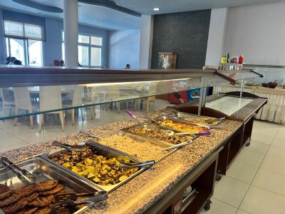 Ubohost,to už si doma dělám snídani lepší,namažu si chleba s máslem,to tu ani nebylo.Na skříni v jídelně k snídani junior salám,Ráma,med,v misce džem,okoralý eidam a studené párky a spoustu vos,těch byl víc než jídla,k pití káva,černý čaj a šťáva.Oběd a večeře v jídelně Rachoni bay,pět pekáčů pro 3 hotely,naprostá hrůza ,jak pro prasata,co zbyde z oběda,dodělá se s paprikou k večeři ,žádná ryba,jen tlusté vepřové maso ,dnes jsem měla rýži s kečupem,ovoce nezahlédnete,maximálně 10 nakrájených plátku z jednoho pomeranče,1x byl červený meloun,zákusky žádné.Takže chodíme na jídlo do místní taverny.Pití u baru,nemyté sklenice a dlouhé fronty.