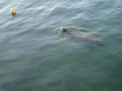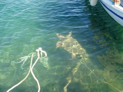 Ovšem tutovka a zážitek, je zajít si do nedalekého přístavu, kam v půl osmé skoro pravidelně, připlouvá červená bárka a nejpozději pět minut po přistání připlouvá největší a nejstarší želvák ze zálivu, který se naučil, že mu rybáři házejí ryby a škeble, které nejdou na prodej. Opravdu tam dva - tři metry před váma, plave sem a tam obrovská, víc jak 100 kilová Careta, kterou pojmenovali místní Sotiris a viditelně jí přítomnost lidí, ani cvakání fotoaparátů s blesky nevadí a doslova se předvádí.