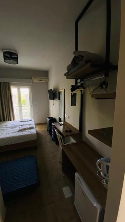 V popisu hotelu a pokojů *** nebylo uvedeno, že pokoje Annex se nenacházejí vůbec v areálu hotelu. Jde o starší budovu s cca 18 pokoji, které neodpovídají kategorii ****. Nenajdete tu ani jednu skříňku, koupelna je malinká, stará a rezavá. Mají problém s tlakem vody, takže buď neteče nebo vyprskne a namočí vše kolem. V koupelně se skoro ani nejde zavřít, jak je malá, sprchový kout miniaturní a je vybaven látkovým závěsem, který se na vás nalepí. Co je ale snad nejhorší je postel pro děti, která je malé skládací kovové lehátko s tenkým molitanem obaleným igelitem. V polovině je tato matrace přepůlená, takže tvoří tvrdou mezeru. Je asi 15 cm od země a je nestabilní. Dětské skládací postýlky, které na pokoje dávají zase nemají matrace vůbec. Ani jedna varianta není vhodná ke spaní dětí. Na tyto pokoje se dostanete po rušné, prašné a vyprahlé silnici, cca 200 metrů od brány hotelu. Vstup k budově ze silnice není nijak zabezpečen. V místě ubytování nejsou dostupné žádné služby hotelu. Je to stejné, jako když si prostě přes booking pronajmete starší a levné apartmány dále od moře. V noci ruší blízký bar (ne hotelový) až do pozdních hodin. Jako pozitivní hodnotím, že jsme dostali skoro každý den jednu 1,5l lahev vody a že tam byla varná konvice na přípravu batolecího mléka. Budova má 3 podlaží a jsou tam jen schody.