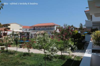 Areál disponuje pěkným bazénem. Nevyužívám bazény ,když jedu k moři. Okolí je takové řecké. Někomu by mohly vadit ty saliny přes které se prochází. Někdy trochu zápach.