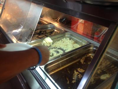 Obědy a večeře: z "řeckých laskomin" zde nabízeli smažená obalovaná játra, játrovou směs, kuřecí křídla, různé hroudy z mletého masa, kuskus zalitý kečupem, pečené přesolené brambory které se topily v oleji, rýži, rozvařenou brokolici, polévku z prášku s těstovinovými kolínky. Jednou bylo suflaki a pita chléb (tzaziky bohuželo chybělo a zrovna by se k tomu tak hodilo) - bylo o pár dni později instantní. Vždy byly rajčata, papriky, okurky, červená cibule, krouhané zelí nebo zelí s majolkou, 2x byl řecký salát. Pokud jde o nápoje, tak zde byli dva automaty, kde se dala načepovat káva, horká voda, horká čokoláda, dále nápojový automat s imitacemi Coly, Fanty, Sprite, Tonicu, soda, voda. Dále výčep s červeným a bílým vínem a pivem, které když došlo, tak prostě nebylo.
