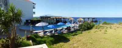 V podstatě souhlasím s předchozí recenzí manželů Likavčanových. Venkovní prostředí studií je nádherné. Všude banánovníky, udržovaný trávník (sekali ho ve 23:00...), slušný bazén pro plavce i neplavce, u baru skvěle situovaná terasa s nádherným výhledem na moře, Kefalonii a plážičky v Amoundi. Jen dlažba u bazénu a po celých schodech dolů k pláži velmi klouže, když je na ní voda. Maria to sice několikrát denně vytírá, ale speciálně na mezipatře u schodů, kde je umístěna sprcha na spláchnutí soli od moře, by musela stát skoro pořád, aby tam nebylo mokro. K Marii jen to ... že jsme se dozvěděli, že je ve 2 měsíci těhotenství a trpí silnými ranními nevolnostmi, tak asi moc důvodů k úsměvu nemá :-)