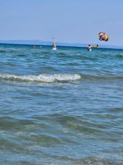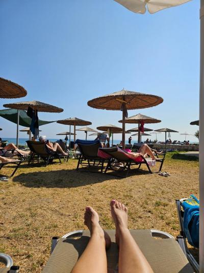 Pláž menší,ale stačí,lehátka funkční i dostatek.Uklizeno,žádné rozbité věci ani špína.Moře čisté, teplé, dlouho mělké,písčité se spoustou mušlicek.Boty do vody nejsou třeba ani pro děti. Promenáda na další pláže příjemná, písek, občas malé oblázky. V útesu u druhé pláže krabi.,takže super podívaná.