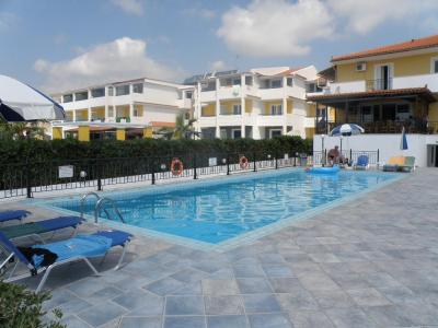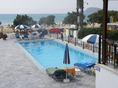 Hotel je situován přímo na pláži na okraji Laganas, z hotelu se dá pěšky dojít během 15ti minut po pláži do rušného Laganas a dále pokračovat procházkou a udělat si výlet po pláži na cca 2 km vzdálený nádherný ostrůvek Agios Sostis. Na pláži v Laganas je živý ruch, jako bývá ve větších turistických letoviscích. Pokud se nevydáte do centra města, ale půjdete po pláži na druhou stranu - na východ, směrem ke Kalamaki, narazíte naopak na velmi klidnou a příjemnou pláž - doporučuji, pokud preferujete klidná místa s čistou vodou. Jen počítejte s tím, že do míst, která jsou dál od moře, je zakázán vstup - kvůli hnízdění želv. Ochranáři želv si tuto pláž velmi hlídají.