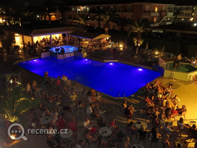 Laganas má zdaleka nejlepší pláže a hotel má lehátka a slunečníky u bazénu, na trávě pod palmami a přímo na pláži (za poplatek). Pláž je z jemného písku s velmi pozvolným vstupem, kde mohou být i malé děti, protože zde téměř nejsou vlny. Voda je velmi čistá a odpolední teplota vody u břehu dosahuje 26 - 30 st.C.