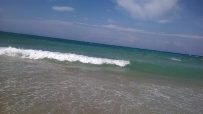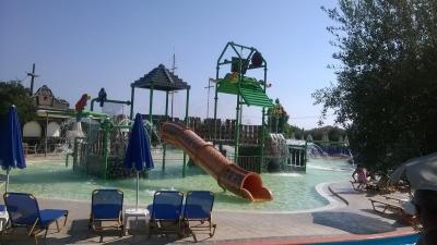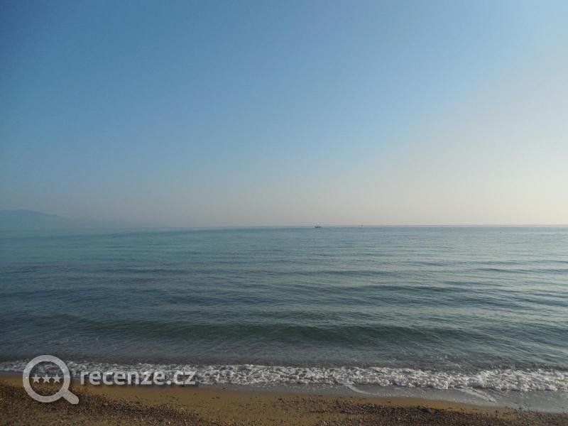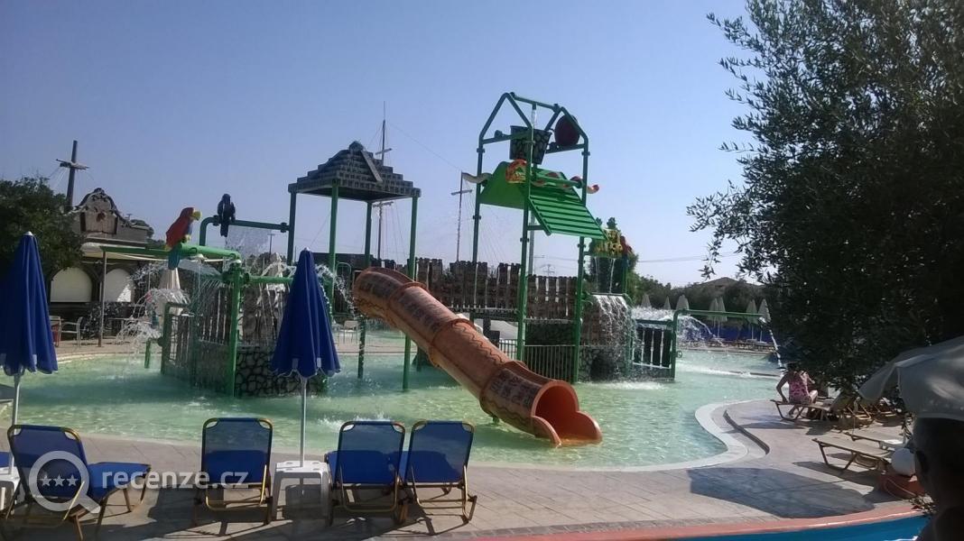 Pláž uzounká, písčitá, před vstupem do vody kameny, ale asi jen 2 m, pak písek. Nebyl problém zaplatit si lehátko. Set za 6 Euro. My jsme to vyřešili tak, že jsme leželi na lehátkách u bazénu, které jsou zadarmo a chodili se vykoupat do moře, které bylo kousek, asi 100 m. Z moře jsem byla nejdříve zklamaná, protože byly velké vlny a moře bylo kalné, ale v průběhu dovolené se nejspíš změnilo počasí a dopoledne bylo moře úplně klidné, odpoledne menší vlnky ,čisté, teplé. Součástí pobytu byl i 2x volný vstup do waterparku, děti se vyřádí, tatínkové taky a maminky si mohou nechat masírovat záda proudy vody.