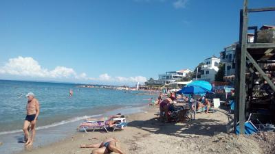 Pláž cca 5 minut. Každé ráno se uklízí - strojně a ručně. (při naplaveninách z bouřky i bagřík) . Lehátka pod cestou ze zahrady komplexu ADMIRAL vlevo 6e. Nad touto částí pláže bazén s něco jako vířivkou a prodejem chlazených nápojů. Do moře je vlez zde kamenitý-skalnatý. Je lépe popojít kousek vpravo pod schody z pláže do restaurace. Tam překonáte kousíček oblázků a pak jen píseček. Vstup do moře - HODNĚ pozvolné.