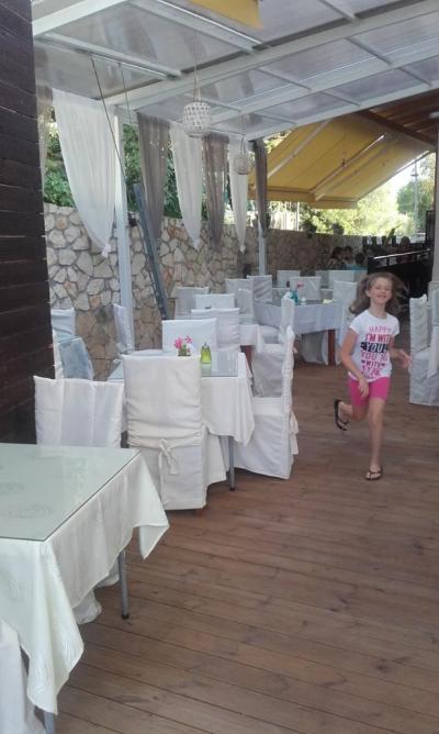 Strava naprosto perfektní, každý den byl k večeři jeden chod mořský (ryba, chobotnice, mušle, kalamáry) a další chody, vepřové, hovězí, skopové, krůtí, kuřecí. Jako příloha nejvíce brambory připravené trošku nakysle, ale chutnaly nám i naší malé. Jeden den skvělé bramborové dukátky, každý den většinou i zeleninová rýže. Jako další chody byly různě zapékané těstoviny, špagety, lilky, cukety, mussaki, prostě řecká jídla. Skopové bylo spíš o kostech než o mase, ale něco se tam našlo :-D Jeden den byly miniburgery, masové koule atd. Určitě si každý mohl vybrat podle své chuti. K tomu spouta zeleniny (výborná zakyntoszká cibule), okurek, paprika, rajče, kompotované ovoce, fetta sýr, eidam, pokaždé dva nebo tři druhy výborných zákusků (cheeskake, mini větrníčky, želé atd.). Nesmím zapomenout také na polévku, ta byla vždy jedna. Každý si může nabrat jídla kolik chce a najíst se tak dosytosti. Nabídku završuje červený i žlutý meloun, nektarinky, červená jablka, blumy, hrozny, pomeranče. I když je strava deklarována bez nápojů, tak je k dispozici zásobník s barelem na vodu. Na snídani vaječné omeletky, vždy nakrájené na čtverečky, mini čtverečky pizzy, 4 druhy chleba (vévodil toastový), zelenina, fetta, eidam, šunka kuřecí i vepřová, vejce natvrdo, mléko, kakao, čaj v konvici bylinkový, k dispozici horká voda na černý čaj, káva, voda, tři druhy džusů. Výborné byly takové malé kulaté bagetky a v nich zapečené vejce se šunkou a paprikou, meloun, máslo i margarín. Vytkl bych, že máslo nebylo vychlazené a bylo hodně tekuté. Bylo balené v malých vaničkách, jedno tak najeden krajíček chleba. Chybu měl jen snídaňový balíček při odjezdu. Dva toustové chleby, mezi tím šunka a sýr, kousek buchty a krabička džusu. Mohli přiložit alespoň jablko a hned by to bylo lepší.
