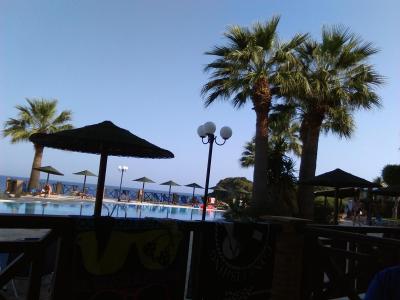 Měli jsme pobyt bez stravy, nevařili jsme, chodili jsme do taverny ve vesnici. Taverna v hotelu, drahá, jídlo nechutné, tuhé maso....... Na pokoji vařič otřesný, 2 hodiny ohřev vody na kafe. Vemte s sebou utěrku a jar, není tam.