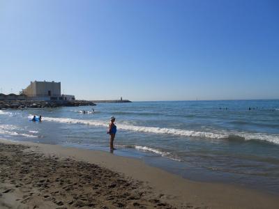 Pláž se nacházela cca 250 metrů od hotelu. Hotel ležel přímo u přístavu Mariny, tak jsme si mohli vybrat, na kterou pláž jít. Chodili jsme na pláž, která byla situována na pravé straně od hotelu. Pláž byla písčitá, při vstupu do moře byly drobné kamínky (cca metr), voda byla příjemná, den ode dne teplejší.