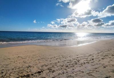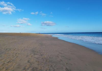 Playa del Matorral je dál od hotelu, ale je dost velká a dlouhá, na obzoru maják a je písčitá s pozvolným vstupem. V březnu bylo dost větrno. Je to veřejná pláž, není hotelová, takže jsou zde lehátka a slunečníky zpoplatněny.