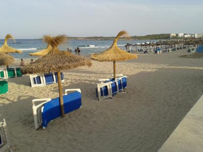 Žlutá písečná pláž je přes malou příbřežní promenádu jen kousek od hotelu. Vstup do moře je až otravně pozvolný, plavat se dá snad až 100m od břehu. Celkem často tu fouká a jsou tu vlny, dva dny nešlo prakticky plavat, jen skákat ve vlnách. Klidné moře je tu nejspíše celkem vzácností, ale možná jsme měli jen smůlu. Za lehátka a slunečníky se na pláži platí 4€/ks/den. Moře je čisté, ale pokud jsou vlny, přiženou na pláž chuchvalce zapáchající trávy. Místní s tím celkem úspěšně bojují a pláž čistí. Škoda, že stejně tak nečistí ty haldy špačků od cigaret. Tohle nás vážně štve, ta absolutní ignorance kuřáků, kteří tisíce nedopalků zamačkávají do písky a dělají z krásného písku humus. Přesto je pláž hezká, nádherně rozlehlá, ale mohlo by tady být více vodních atrakcí. Pozor na prodejce melounů - dva klínky za skoro 20€ byly naším nejdražším melounem v životě. Za tu částku si v každém místním Sparu koupíte celých melounů deset.