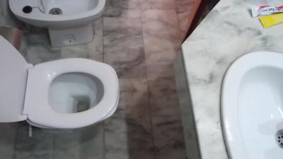 Záchod nefungoval pořádně, ale dost ho opravili. Koupelna příliš úzká ještě že jsme štíhlí. Obézní by neprošel mezi umyvadlem a záchodem. Občas se před mísou tvořila loužička patrně z netěsného potrubí odpadu.