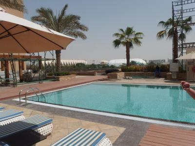 Bazén, každých 35 min jezdí shuttle bus (okruh F1, aquapark, ferrari world, Yas Beach)