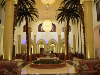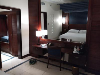 Pokoj střední velikosti, s širokým DBL lůžkem a vší možnou /i nemožnou/ výbavou - jde sice o drobnosti, ale ještě nikdy jsem neměl tolik výbavy, zejména pak individuálních "serepetiček", Župan a trepky jsem již zažil i dříve, ale osobní váhu ještě nikdy, stejně tak zvětšující a podsvětlené kosmetické zrcátko a celkem 8 různých kosmetických přípravků či pomůcek. Osvětlené skříně /po otevření/ též nejsou všude, stejně tak jako kávo/čajovar moderního typu, na kapsle, s nabídkou nejméně 6 druhů nápojů. Denně doplňována balená voda, bez ohledu na spotřebu i pro SGL denně přibyly 2 nové půllitrové lahve. Pochopitelně též trezor /zdarma, s jednoduchým ovládáním/, TV s více než 50 kanály /nabídka vázána v ryté kožené vazbě/, lednice /prázdná, ale funkční/ a výtisk koránu... Množství nejrůznějších svítidel, včetně difúzního osvětlení hlavní stěny, ovládání převážně od každého lůžka. Krytý balkon, se stolkem a 2 židličkami s podsedáky - za celý týden bylo pouze 1x opomenuto zavření dveří otočným knoflíkem, ale vždy byla pečlivě zasunuta dětská pojistka...