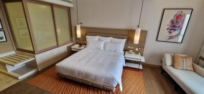 Hotel má cca 190 pokojů, pokoje 1.-3. patro mají výhled do zahrady, pokoje 4.-6. patro výhled na moře. Všechny pokoje mají balkón, vanu i sprchový kout, nespresso kávovar.